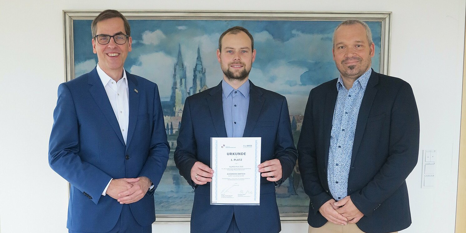 Prof. Dr. Ralph Schneider, Präsident der OTH Regensburg (links), und Prof. Dr. Thomas Schratzenstaller (rechts), gratulierten Alexander Bartsch (Mitte) zum ersten Platz beim BayWISS-Preis 2025. Foto: OTH Regensburg/Nicole Niedermayer