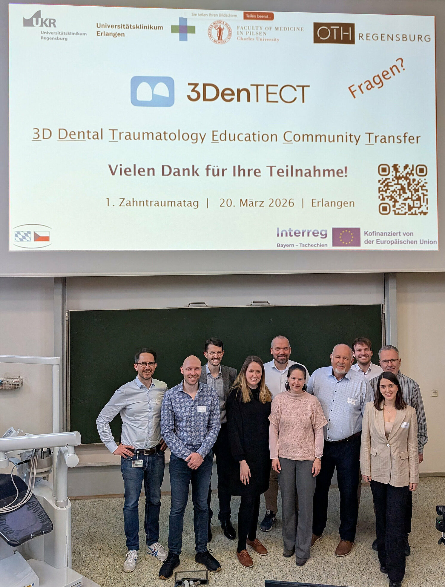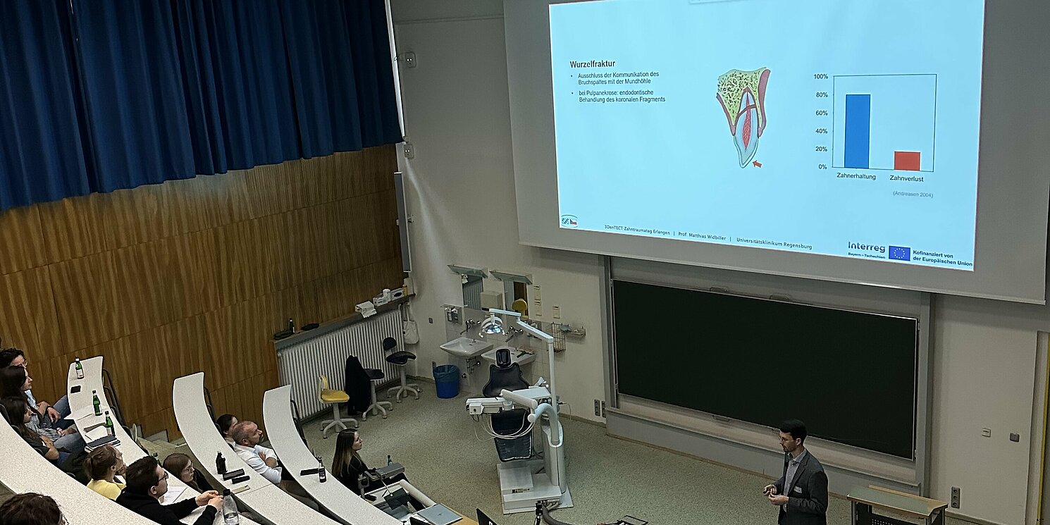 Im Rahmen des vom Labor für Medizinprodukte der OTH Regensburg geleiteten EU-co-finanzierten Projektes 3DenTECT (3D Dental Traumatology Education Community Transfer) zur Verbesserung der Versorgung von Zahnunfällen in der bayerisch-tschechischen Grenzregion fand am Freitag, den 20.03.26, der erste projektbezogene Zahntraumatag an der Klinik für Zahnerhaltung und Parodontologie des Universitätsklinikums Erlangen statt. Insgesamt über 75 Teilnehmende waren vor Ort oder online per Videoübertragung dabei und lauschten spannenden Fachvorträgen des Projektteams.