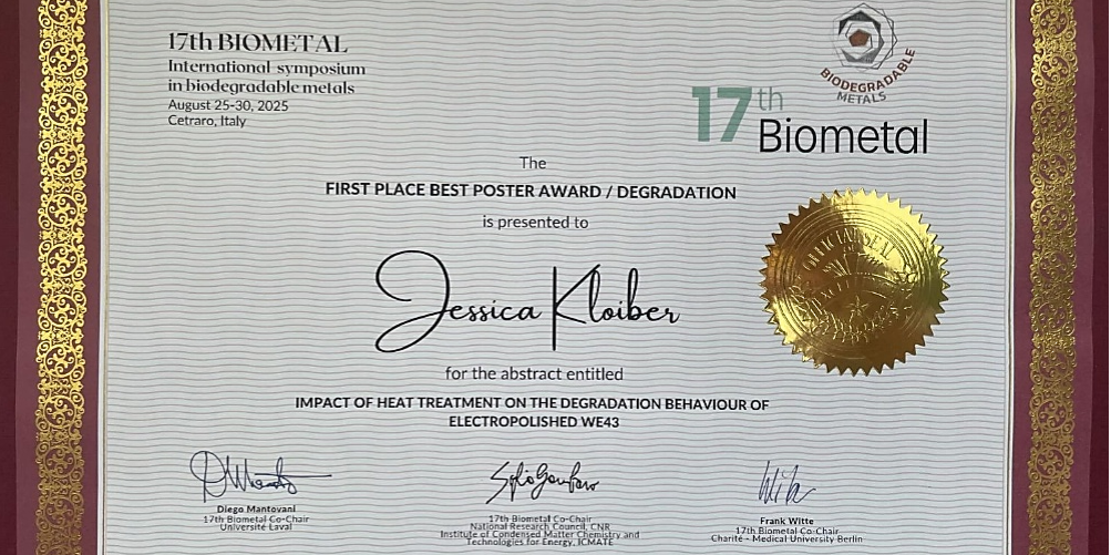Besonders erfreulich für uns war die Auszeichnung unseres Forschungsbeitrags mit dem 1. Platz in der Kategorie Degradation (Session Corrosion plus Session in vitro & in vivo).