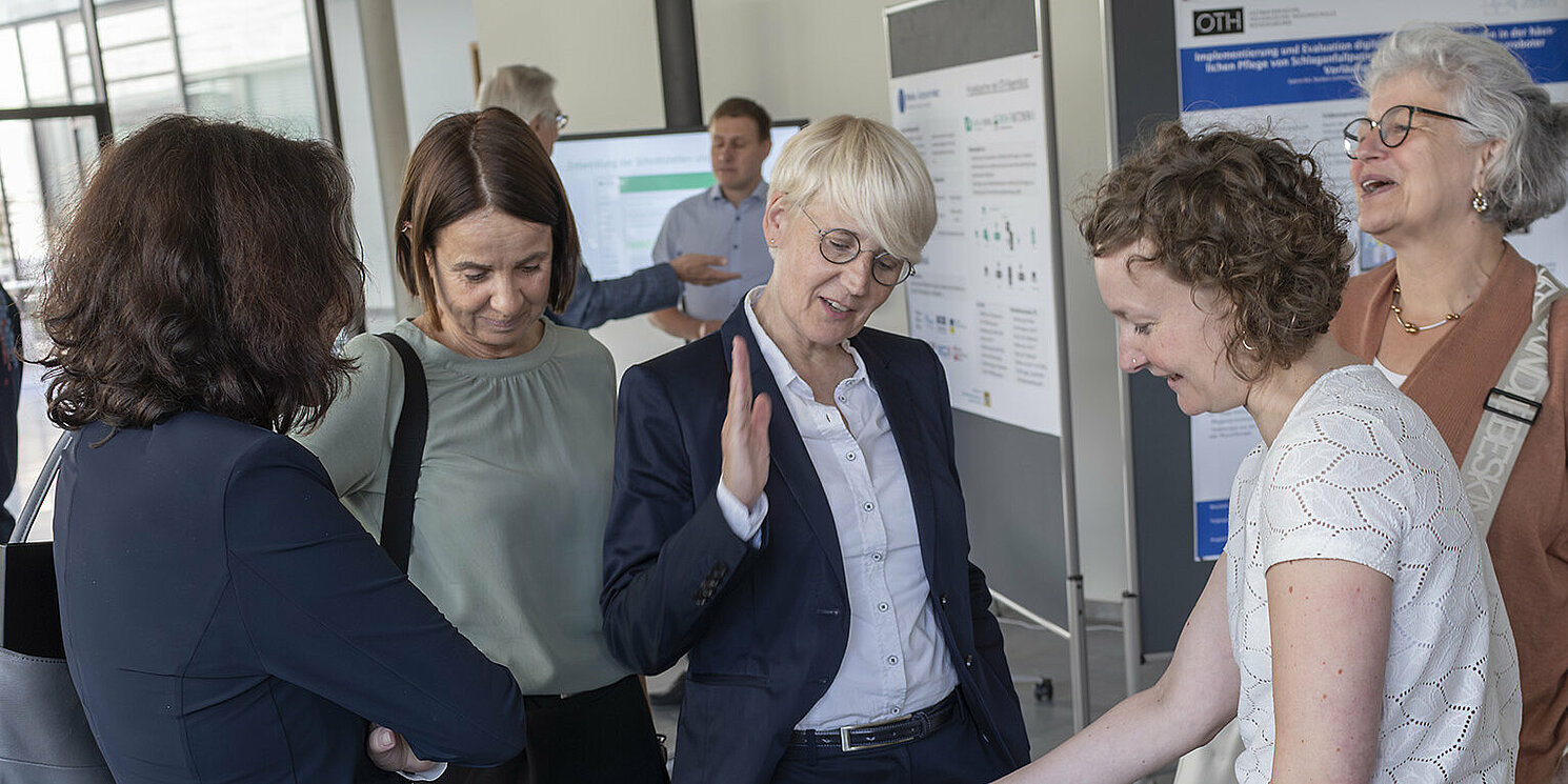Als Erfolgsgeschichte nannte Prof. Dr. phil. habil. Karsten Weber, einer der Direktoren des RCHST, das Projekt DeinHaus 4.0 Oberpfalz – TePUS. Beteiligt daran sind sechs Mitgliedslabore des Centers. „Wir erproben einen Assistenzroboter, der Schlaganfall-Patienten nach dem Klinikaufenthalt zuhause bei der Reha und bei Alltagsaufgaben unterstützt“, erklärte Prof. Weber. Die Ergebnisse werden im Herbst vorgestellt. „Doch so viel kann ich sagen: Die Patienten kommen mit dem Roboter sehr gut zurecht“, sagte der Wissenschaftler. „Für die Pflegewissenschaft ist das RCHST ein Glücksfall“, sagte Prof. Dr. Annette Meussling-Sentpali, Professorin für den Fachbereich. Pflege als akademisches Studienfach gebe es erst seit wenigen Jahren und auch die Pflegewissenschaft ist in Deutschland eine junge Disziplin. „Im Center können wir uns gleichberechtigt mit den Ingenieurswissenschaften einbringen und das Forschungspotential voll ausnutzen“, so die Professorin.